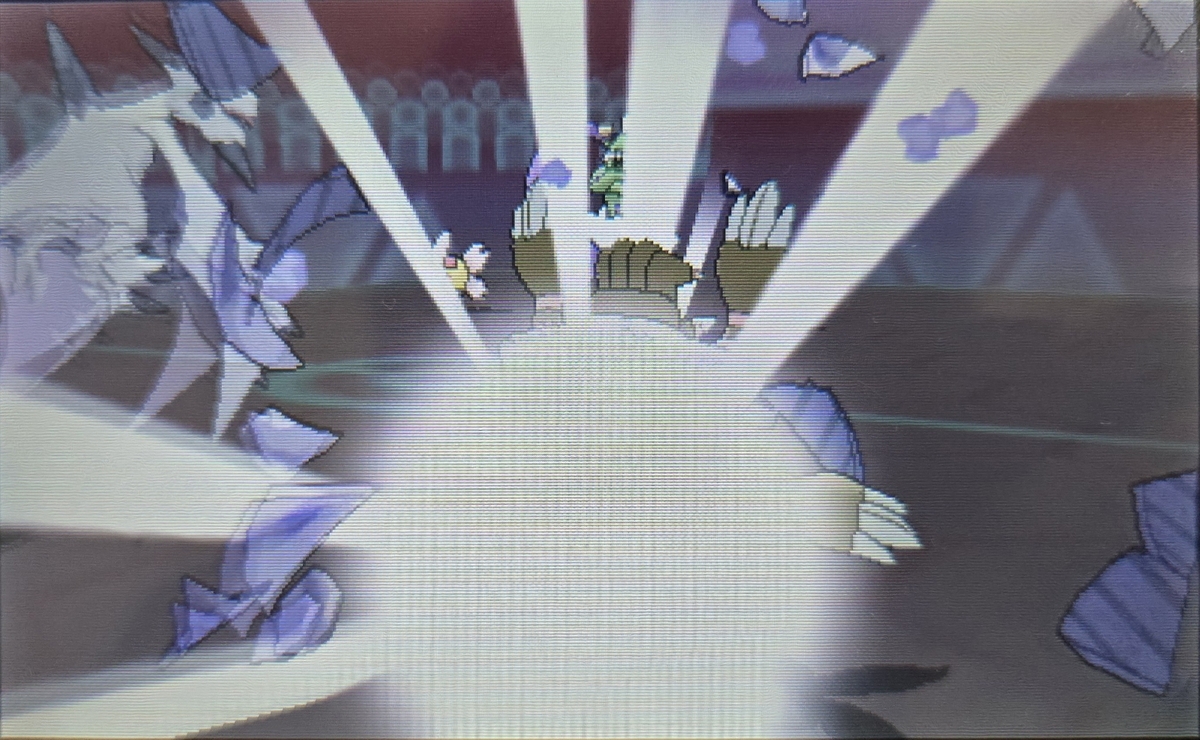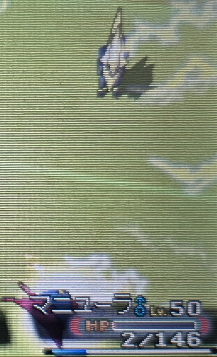 ガメを凍らせた吹雪で共に倒されたゲッコウガに代わって繰り出したプテラのワイガで続く吹雪を凌ぎつつ溶けることを祈るもまだ溶けず。